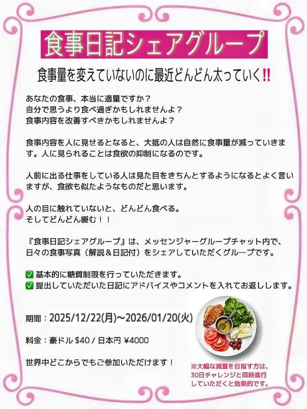 『食事日記シェアグループ』で今の食生活を変えて太らない体づくりを一緒にしていきませんか?