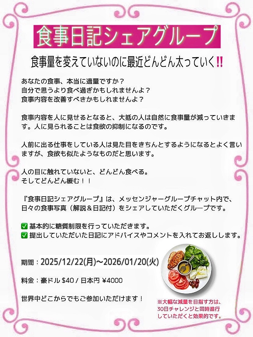 『食事日記シェアグループ』で今の食生活を変えて太らない体づくりを一緒にしていきませんか?