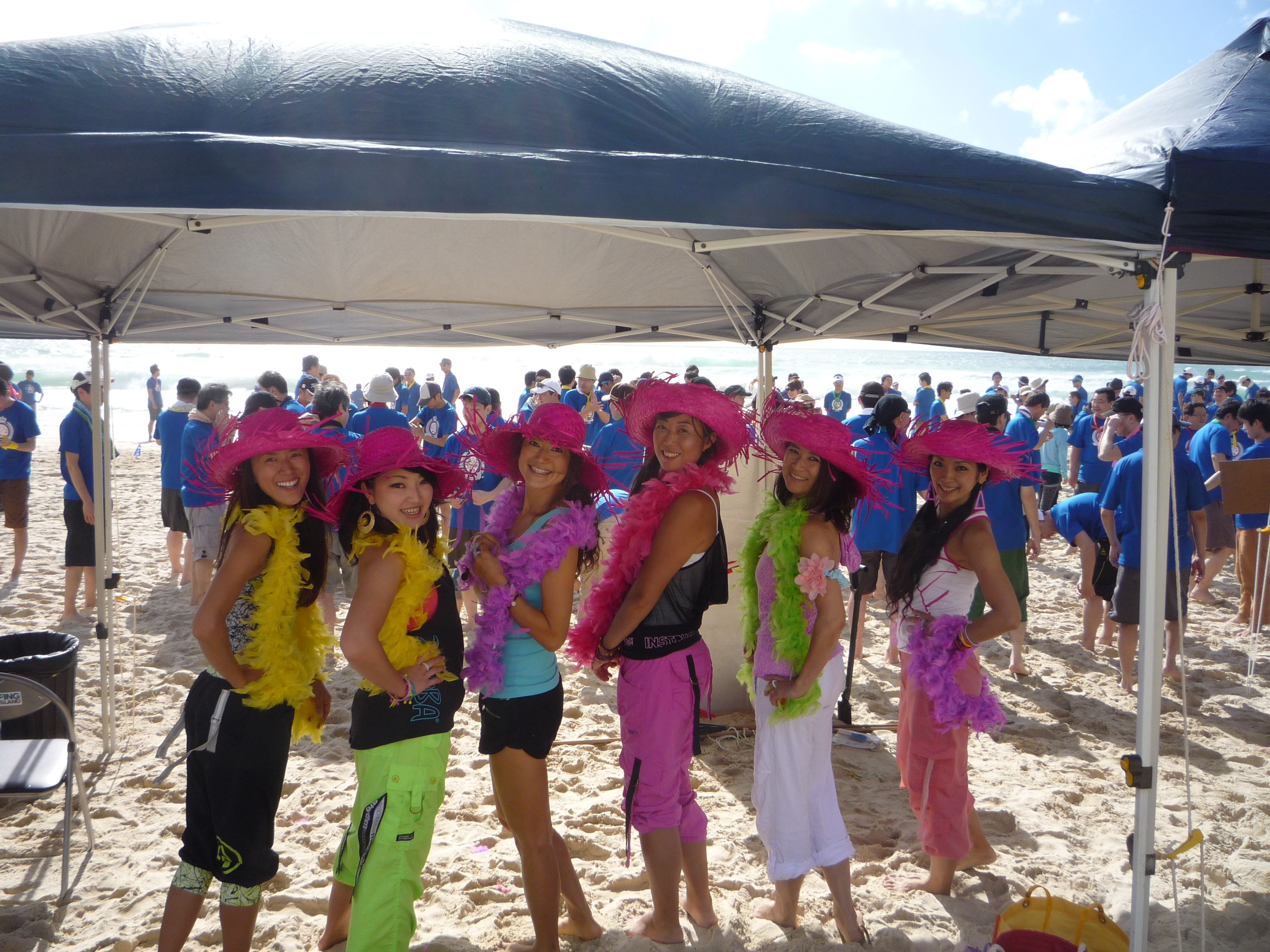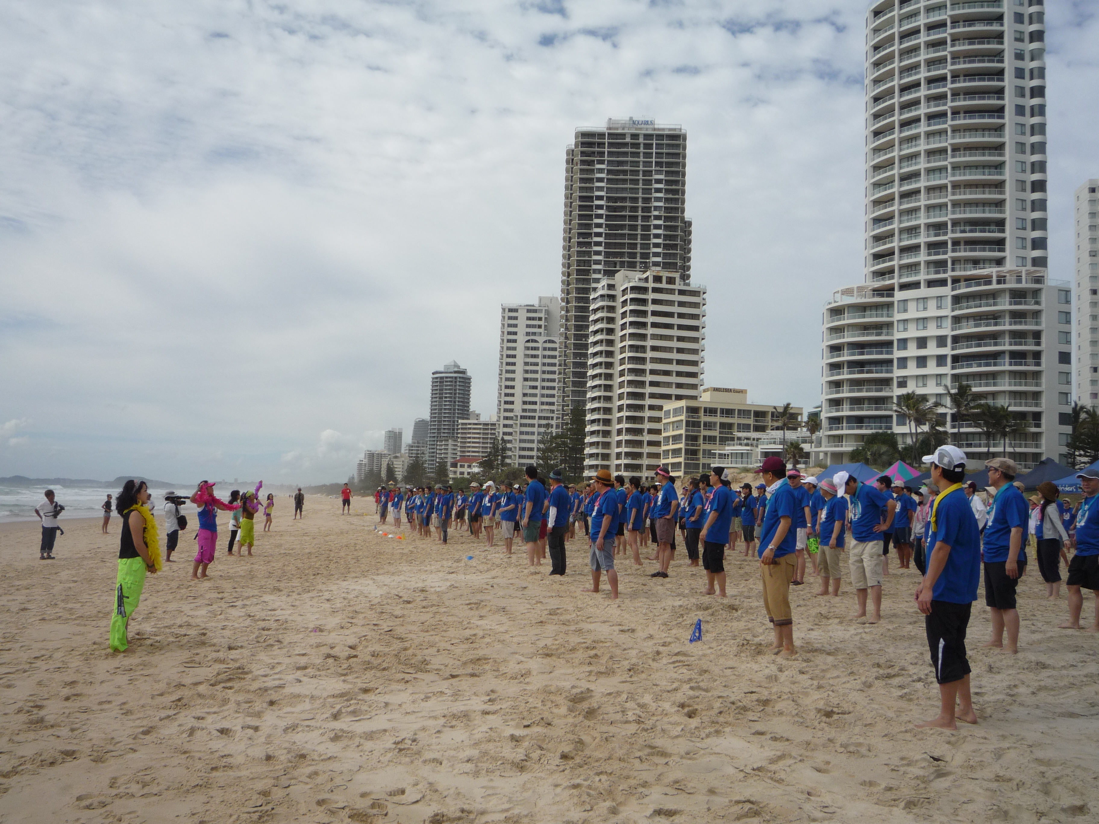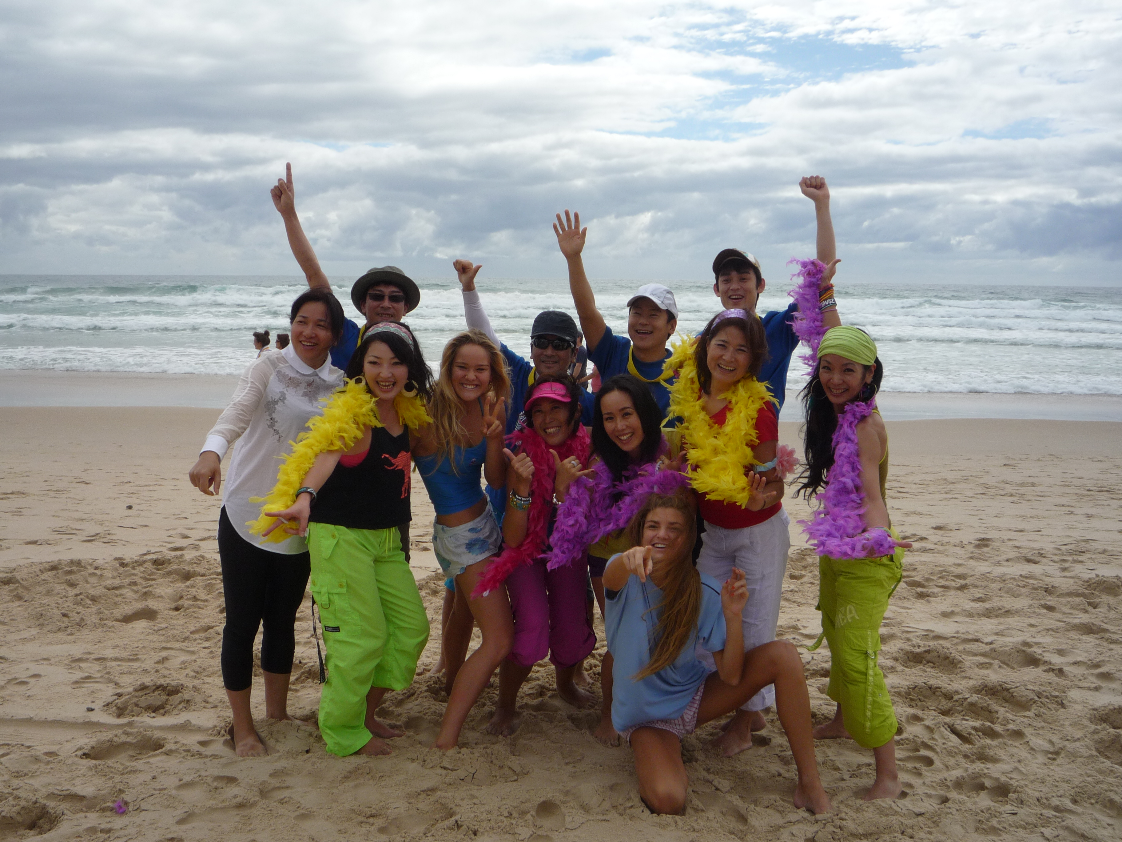 サーファーズのノースクリフ・サーフクラブ前のビーチで、株式会社イシダ様の社員旅行、ビーチ運動会の準備運動としてZUMBAを踊りました。これは第1回目のときのもの。