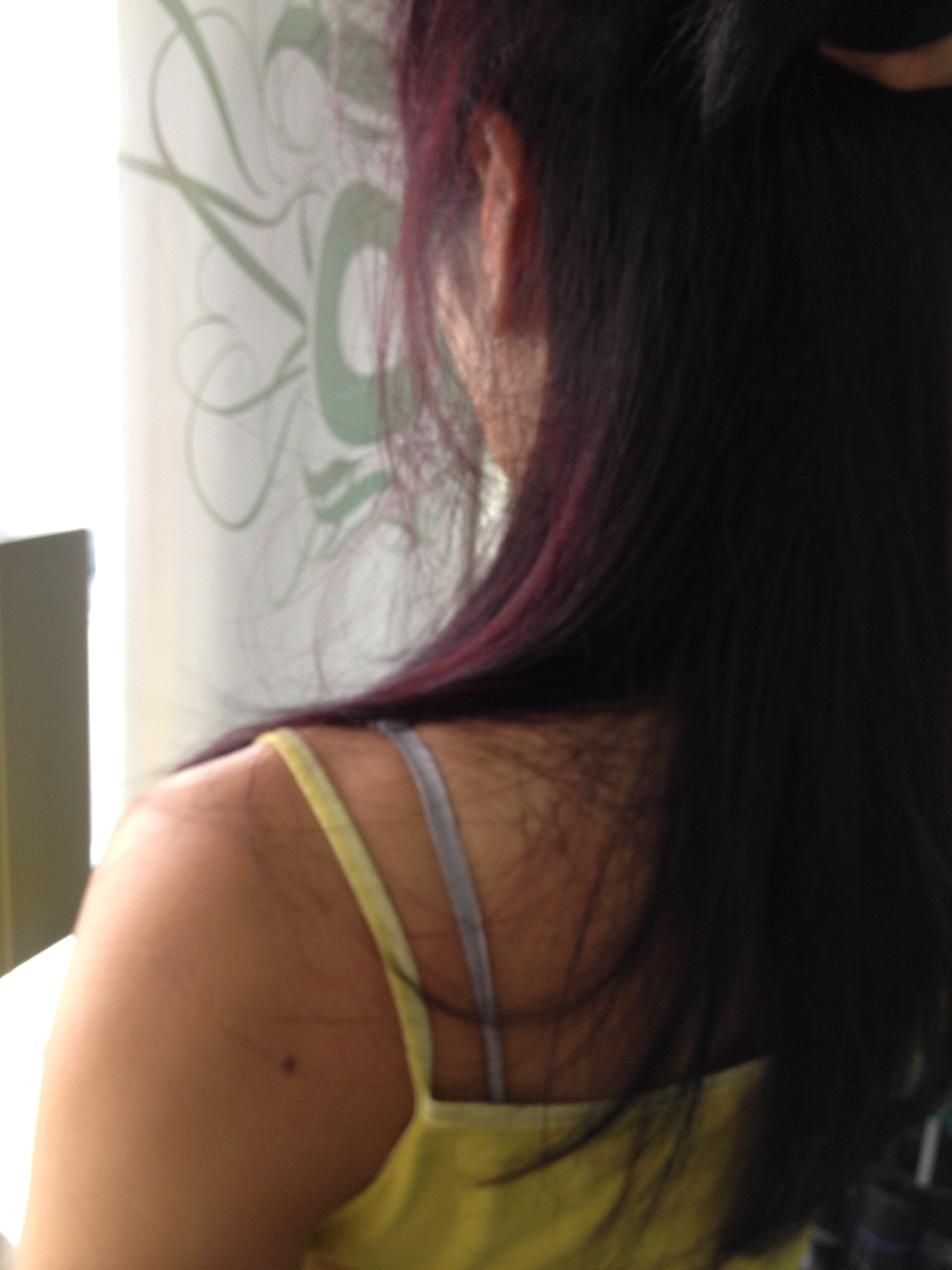 写真だと分かりにくいかもしれませんが…日に透けると、赤いのがしっかり見えます。髪をアップにしたときのほうが、それがよく分かるように仕上げてくれました。そういう心遣いも嬉しいです!!(私が職業上、髪を上げてることのほうが多いからって)