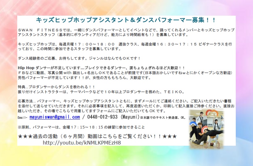 大人のためのジャズクラス、キッズヒップホップクラス、パフォーマンスメンバーの合同発表会、企画中!!