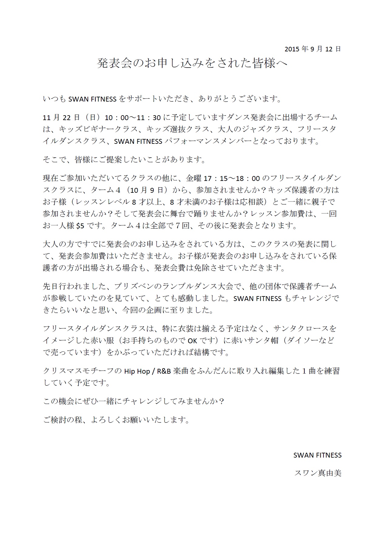 今年も会場は同じですが、キッズだけでなく、大人のジャズクラスとフリースタイルダンスクラスの皆さんと、SWAN FITNESSパフォーマンスメンバーを加えた合同発表会を計画しています。