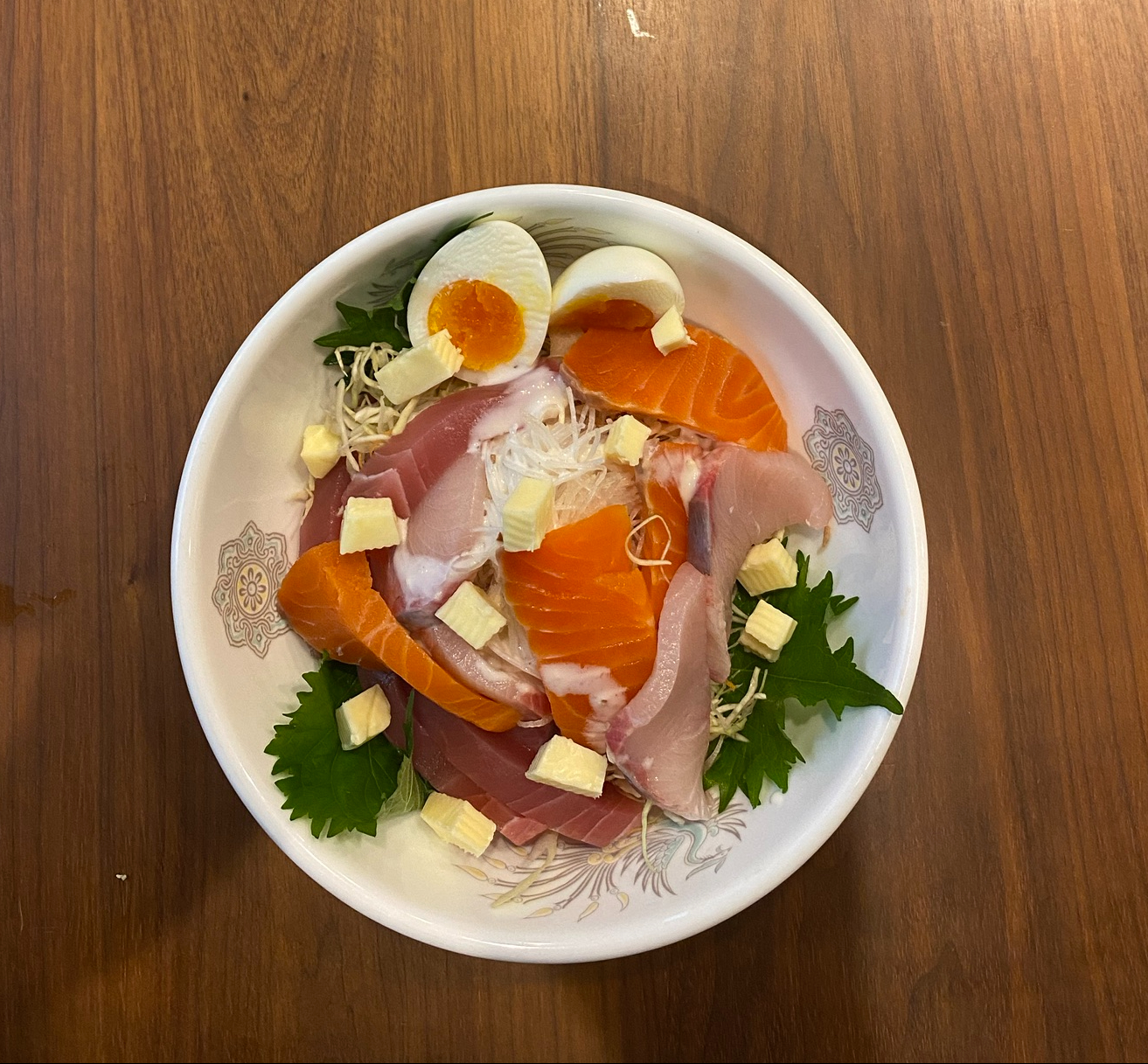 醤油を使いたくなかったので、刺身の盛り合わせをアレンジしてサラダミックスの上に乗せた『オリジナルシーフードシーザーサラダ』を作成!!刺身は、ハマチとサーモンとマグロである。
