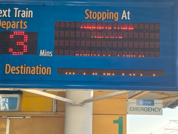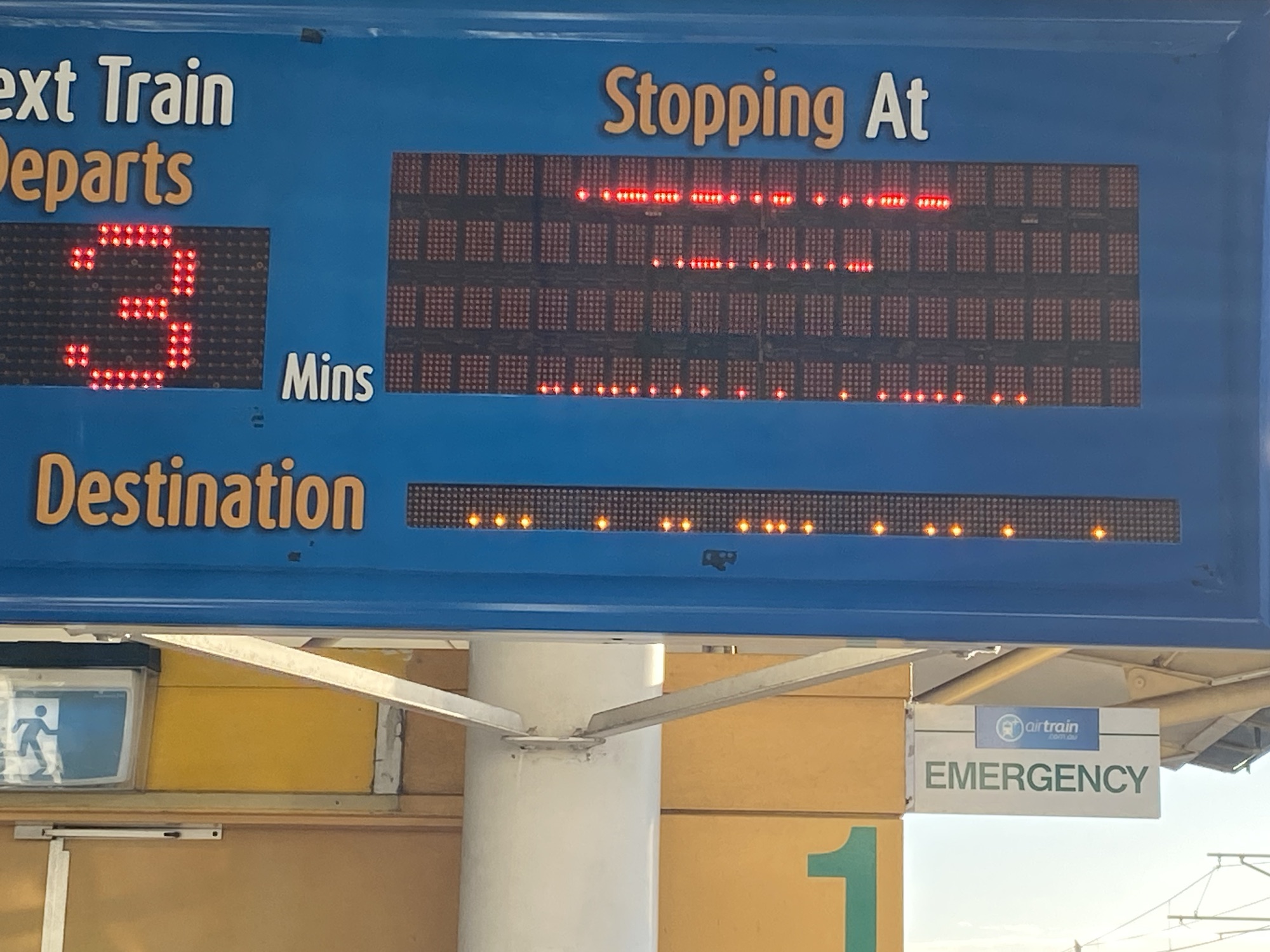 プラットホームには路線図が張り出されていてどこの駅に止まるか明確にされていたし(クーメラに止まるのはオレンジ色のGold Coast Line)、電光掲示板にも停車駅が全て表示されていた。普段のオーストラリア社会はそんなに親切じゃないのに、ここは空港だし外国人観光客のためなんだろうなぁと感心しながら電車を待ってたよ。