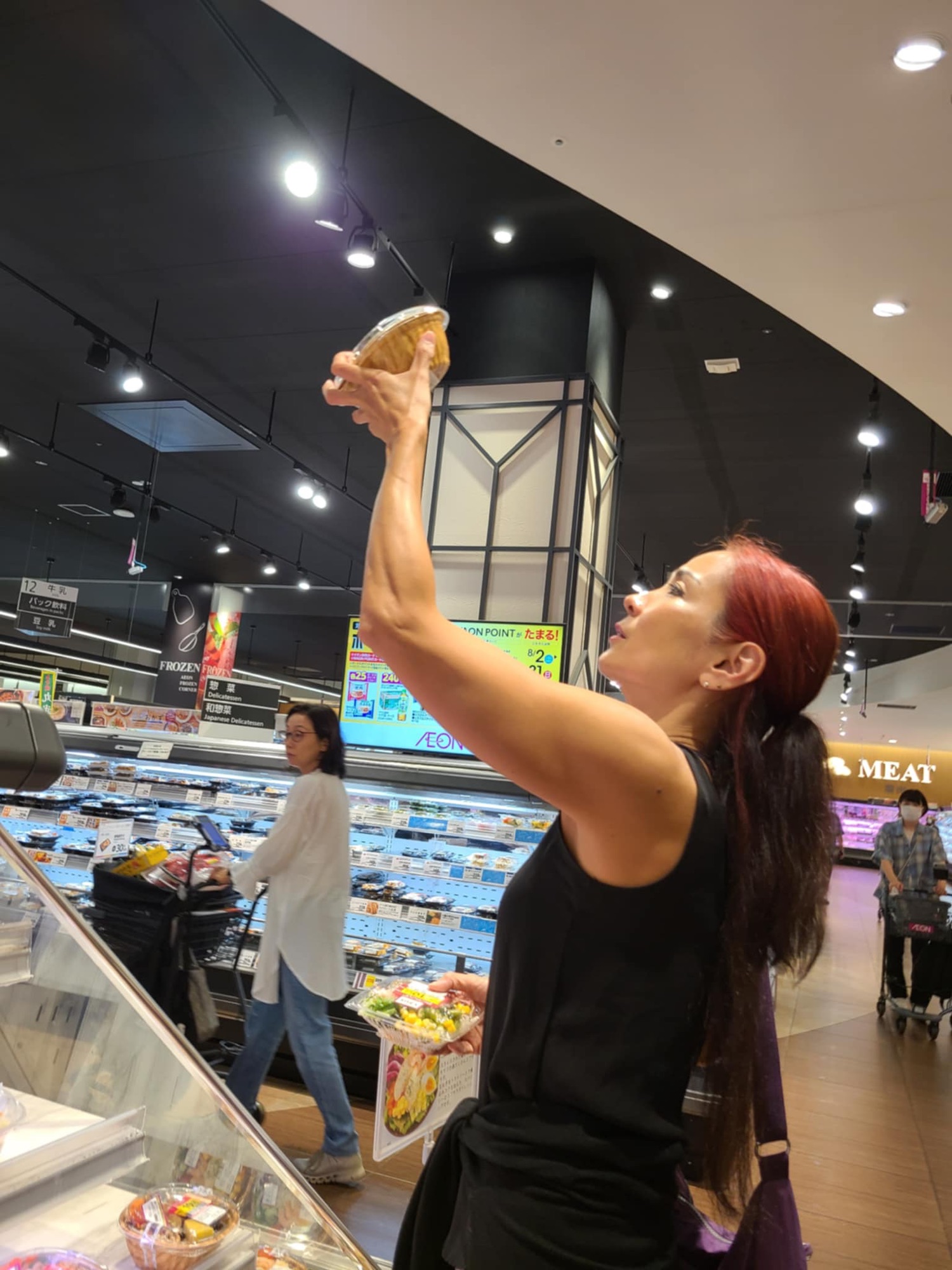 みっちゃんに激写された「サラダの裏側に張ってある成分表を真剣にチェックする様子」