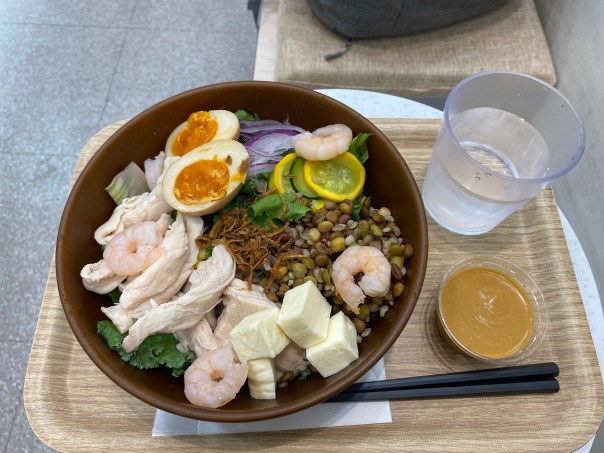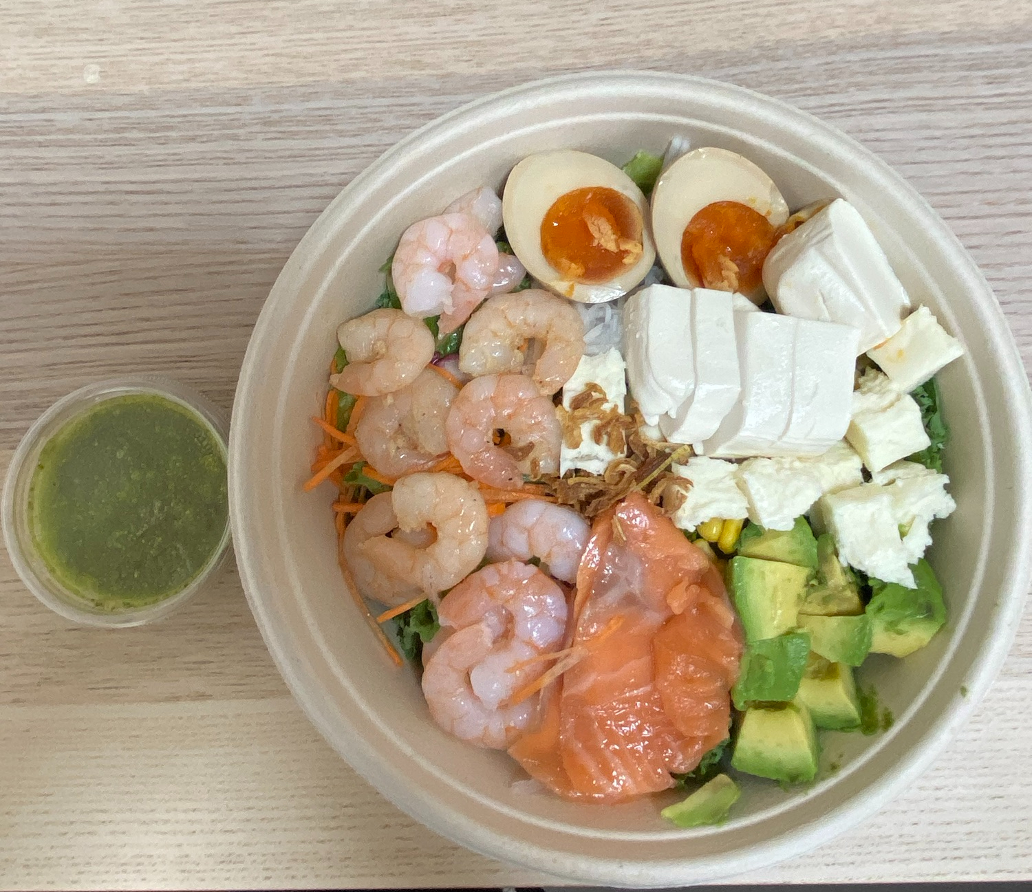 ダブルシュリンプサラダに豆腐とモツァレラチーズ、アボカド、サーモン、煮卵をトッピングに加え、ドレッシングはバジルオリーブをチョイス。美味でありました✨