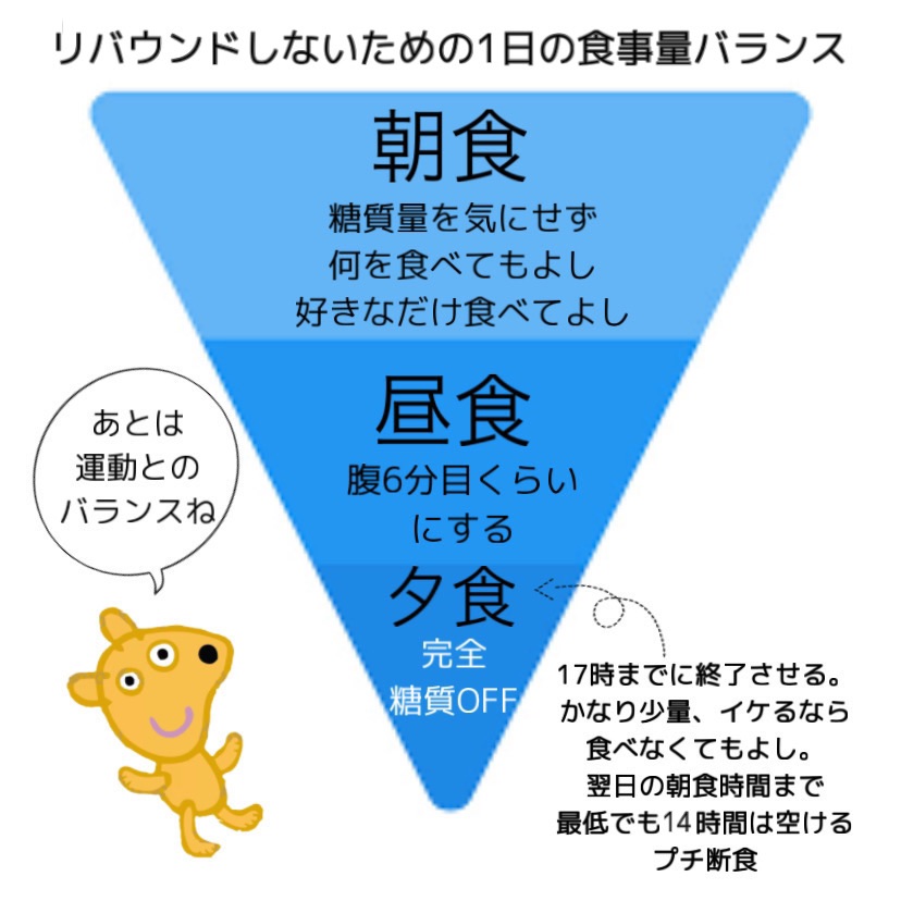 30日チャレンジ食事日記シェアグループというダイエットプログラムを開いている身としては、ボディコンテストに出場するしないに関わらず、常に逆三角形の食べ方を自ら実践している。下の図はクライアントさんたちに推奨している1日の食事量バランスである。