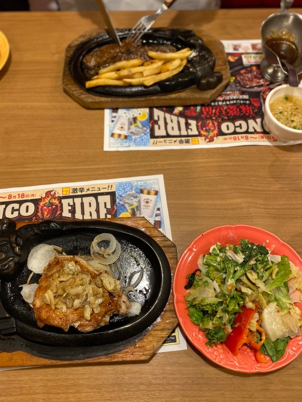 私は糖質制限中なので、頼んだチキン料理に添えられていたフライドポテトを恵子氏の鉄板に移させてもらった。綺麗に食べてもらったw