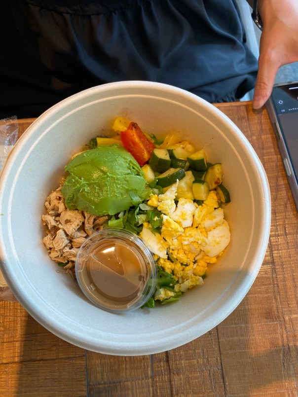 サラダとスープ、ジュースは選べるので、サーモン(他にチキン)、ベジスープ味噌(他にベジポタージュ、ベジスープ醤油)にケールジュース(他にトマトジュース)にした。